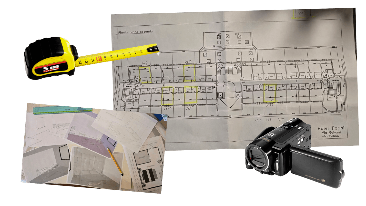 Ogni progetto inizia da un'accurata raccolta di informazioni sull'operazione immobiliare. Questa prima fase di presa misure e shooting fotografico può avvenire sia fisicamente per immobili già visitabili, oppure virtualmente nel vostro studio in caso di cantieri in stato embrionale.