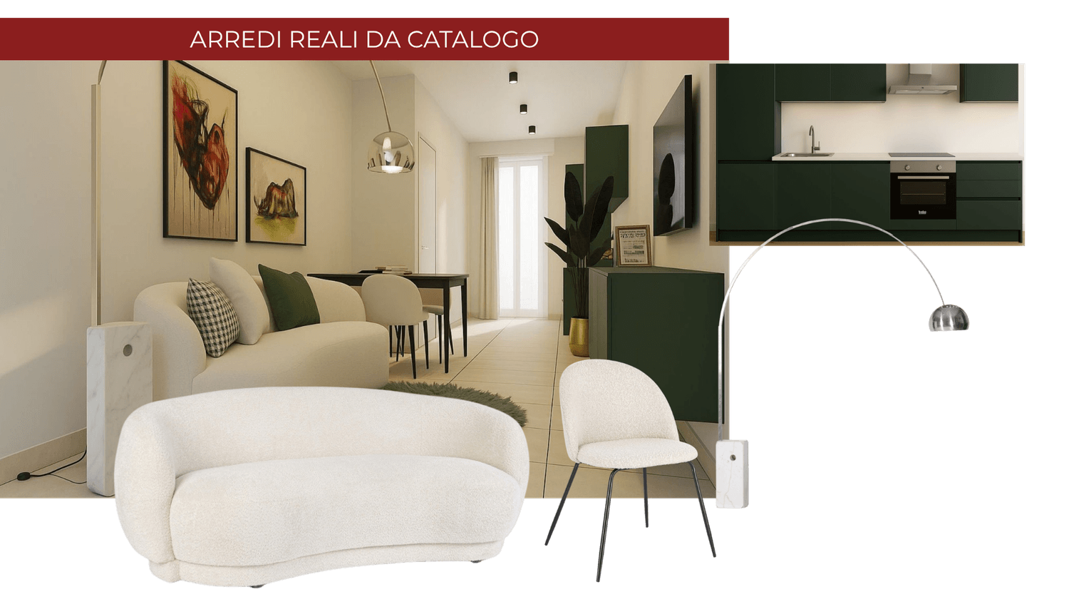 Andremo a selezionare dai nostri cataloghi di fornitori di design contemporaneo arredi e complementi che realizzino davvero il progetto idealizzato dai render. In questo modo si potrà offrire al cliente finale l'opzione di scegliere un'abitazione chiavi in mano completa di ogni dettaglio e dallo stile elegante e moderno con l'ulteriore vantaggio economico dovuto al risparmio dei normali costi che un privato avrebbe per la progettazione, gli arredi e per il trasloco.